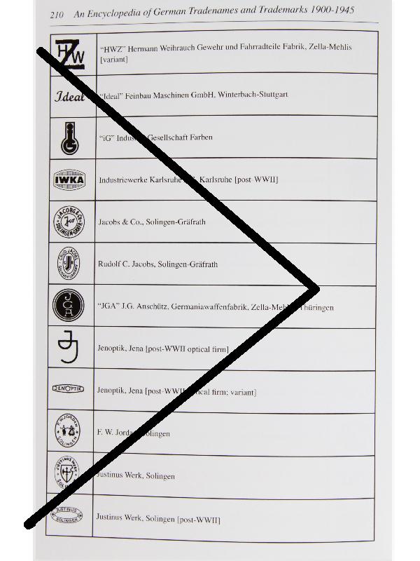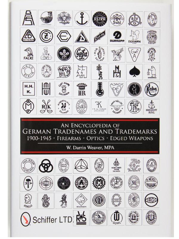 New, in print and in stock: German Tradenames and Trademarks An Encyclopedia of German Tradenames and Trademarks 1900-1945 Firearms Optics Edged Weapons Available NOW from the author, military book retailers or Schiffer Military Books, Inc.
